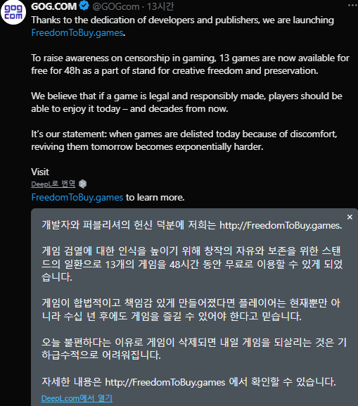게임 검열관련 항의차원에 48시간 동안 무료게임을 배포하는거다. 자세한 내용은