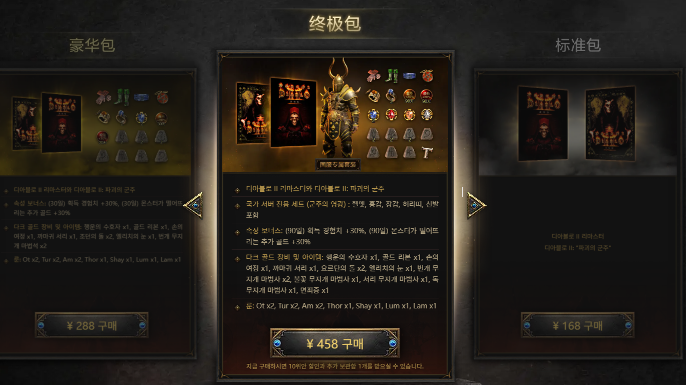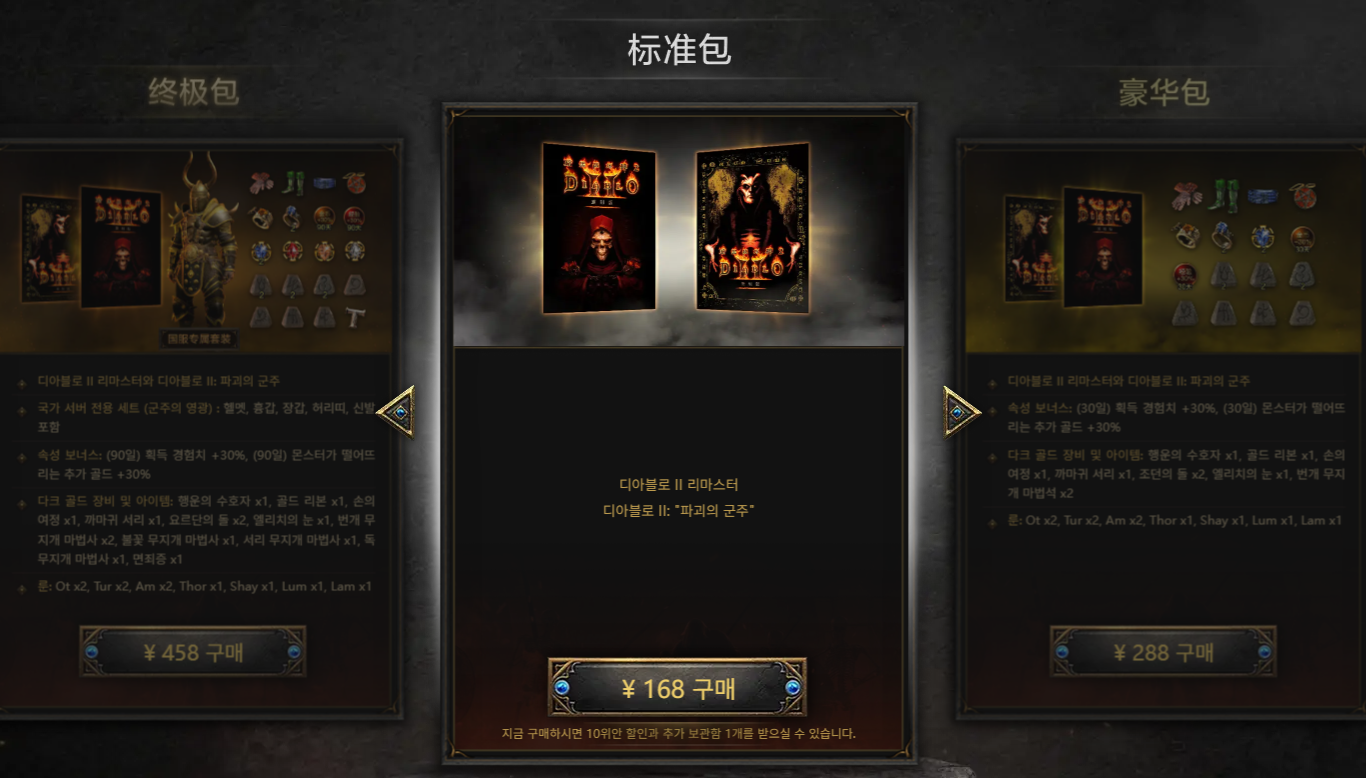 중국은 디아블로2 판매가 안되고 있었던것 같고 이번에 첫 출시인듯 하다. 여러가지 패키지를 판매 하는데 주목할것은