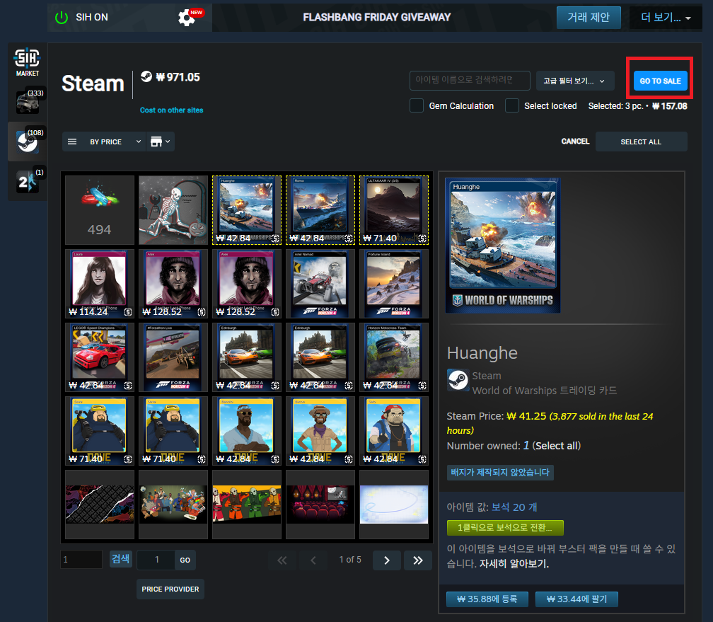 하나씩 팔수도 있고 선택해서(그리고 배지앞에 흰색으로 보이는 숫자가 평균 판매 가격이다.)