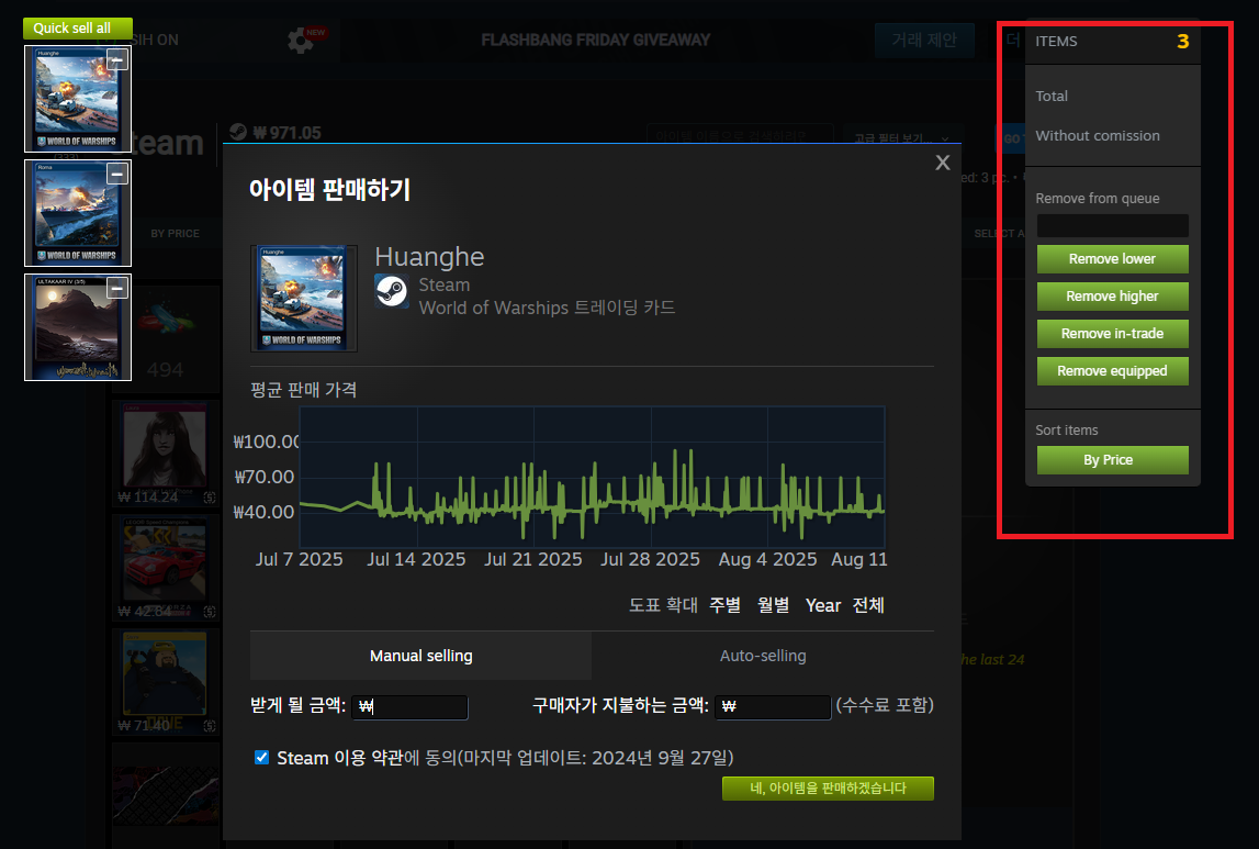 받개될 금액 입력하고 약관 동의 아이템 판매 이런식으로 판매가 된다. 굉장히 번거롭다.