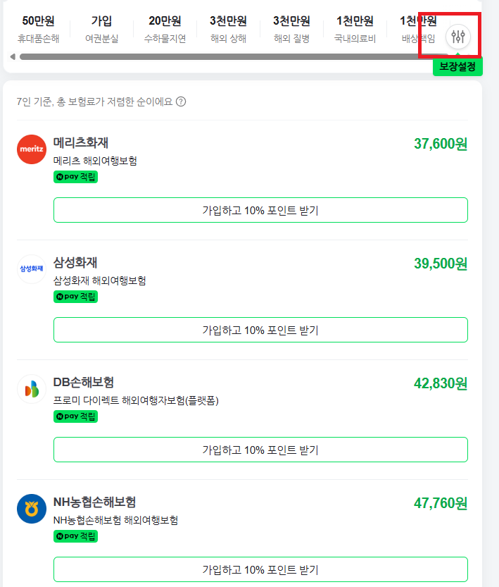 이렇게 결과가 나온다 나이별로 금액이 산정이 되는데 난 7인 기준으로 위와 같이 금액이 나왔다. 메리츠화재가 제일 저렴하다 위에 보장설정을 눌러보면