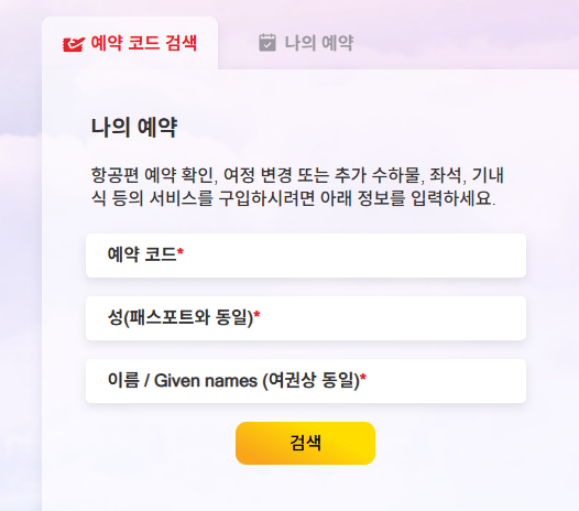 이름과 예약 코드를 입력 하면 되는데 예약 코드는