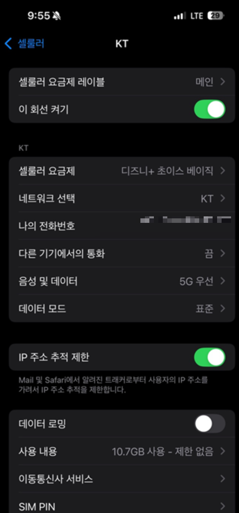 자 이제 데이터 로밍 차단을 하자 esim 로밍도 샀으니 하고