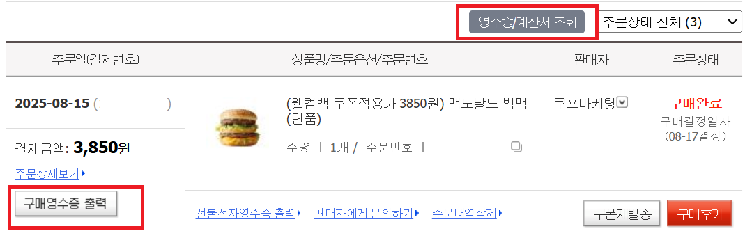 옥션 같은 경우는 주문내역에 보면 구매영수증이 바로 보이고 위에 영수증 계산서 조회 눌러보면