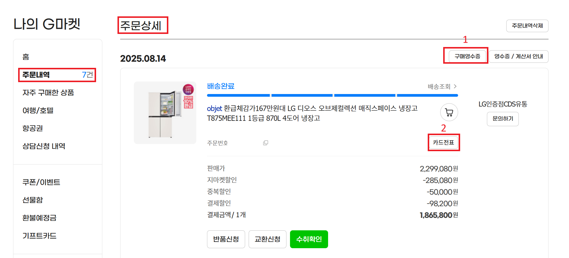 G마켓 기준 주문내역 주문상세를 들어가면 이렇게 떠 있다. 1번 구매영수증이 거래내역서 이다. 2번은 카드전표는 카드매출전표 이다.