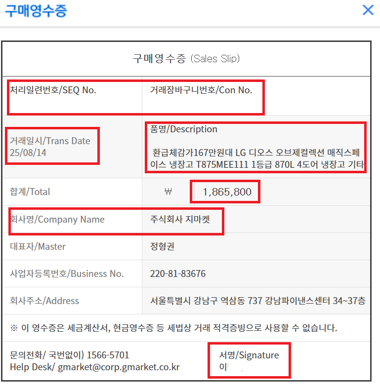 G마켓 예시긴 한데 구매영수증으로도 동일하게 사용이 가능하다. (위에 보면 내용이 다 있다.)