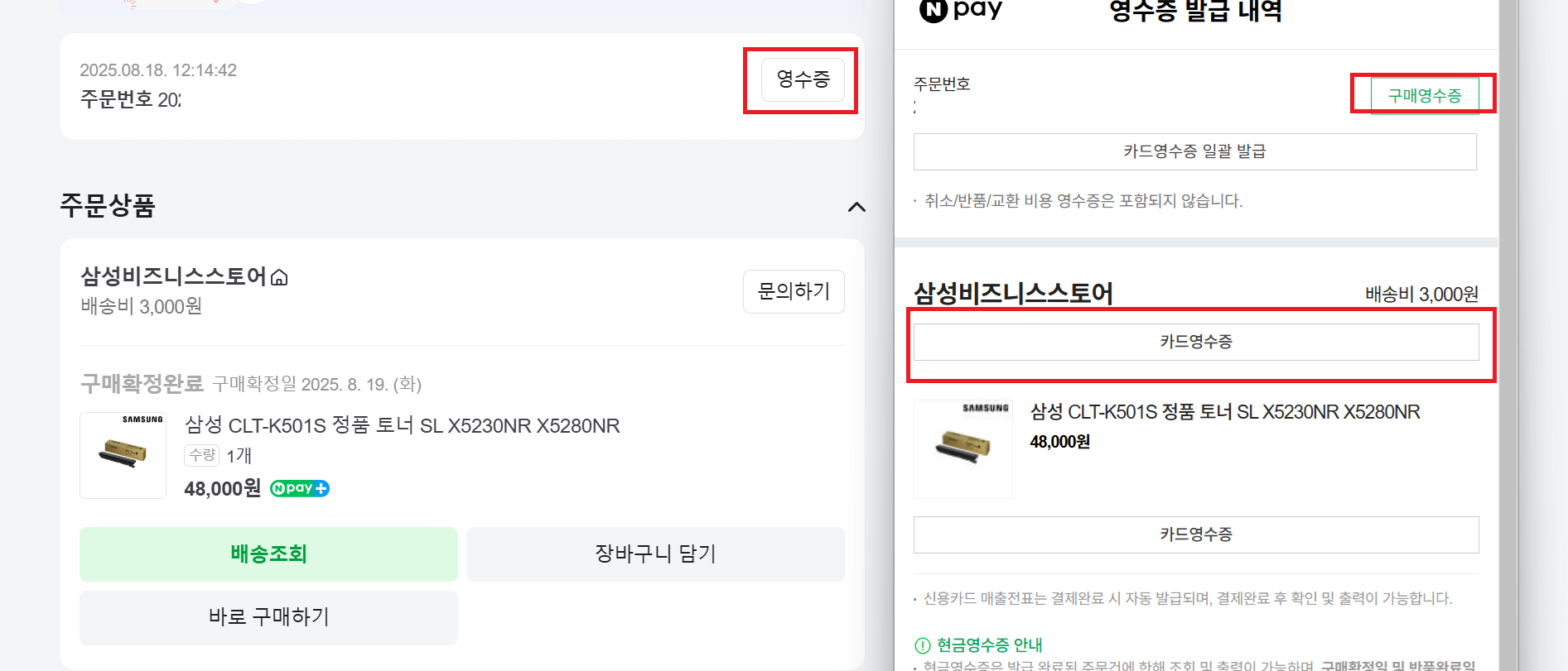 네이버 페이도 세부항목에 들어가면 영수증 누르면 위에 구매영수증과 카드 전표를 확인 할 수 있다.