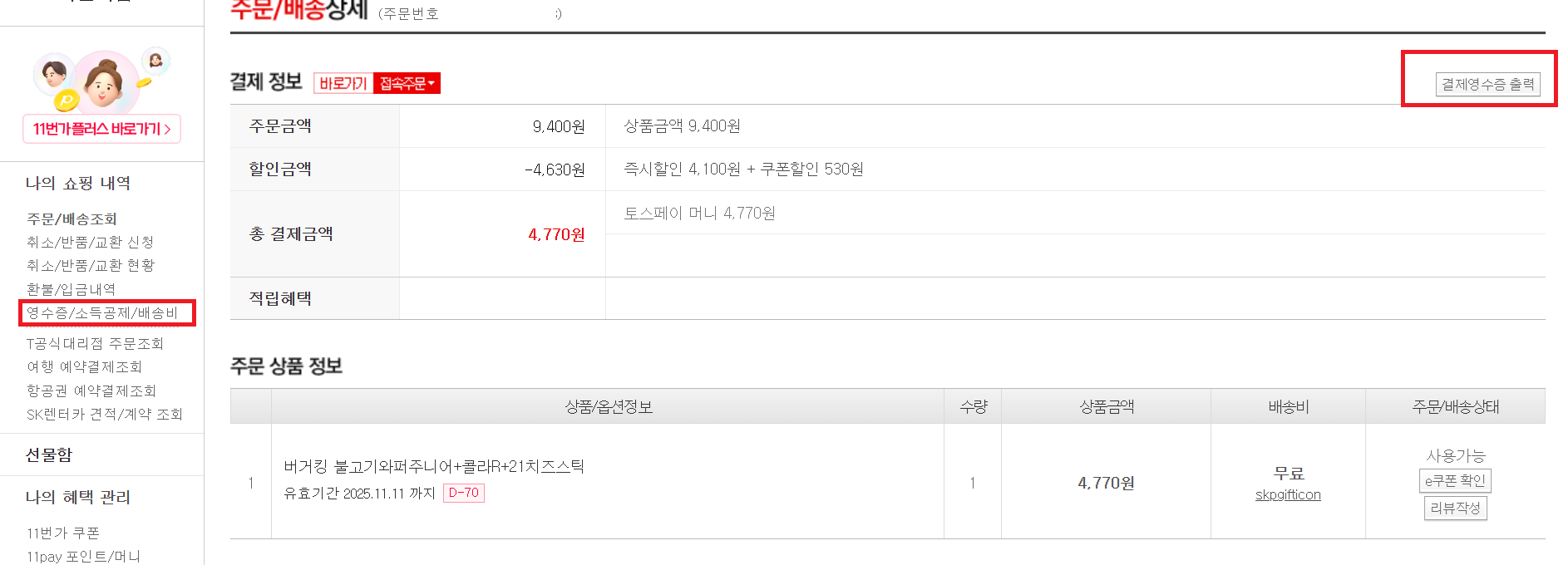 11번가도 주문내역 세부내역 보면 오른쪽위에 영수증 출력 가능하고 왼쪽에는