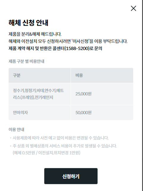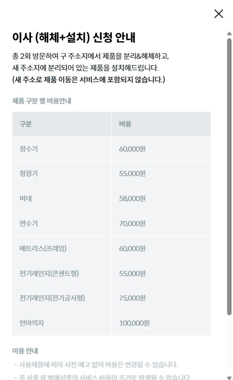 말그대로 해체만 하고 철수 이사 이후 와서 설치 해주는 방식이다. 정수기는 이동은 안해준다. 가격은 6만원