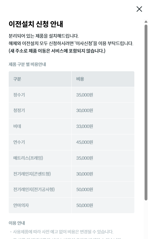 이전 설치 신청한 날 문제 없이 설치가 되었다. 이전 설치비는 렌트비 결제 되는곳에 합산 되어 다음달 요금으로 나온다고 한다. 뒤에 선들은 굳이 안가져와도 되고 정수기 본체만 가져 오면 된다.