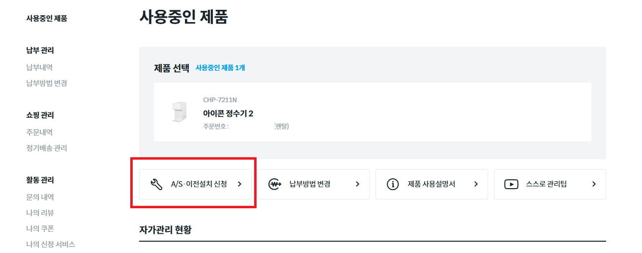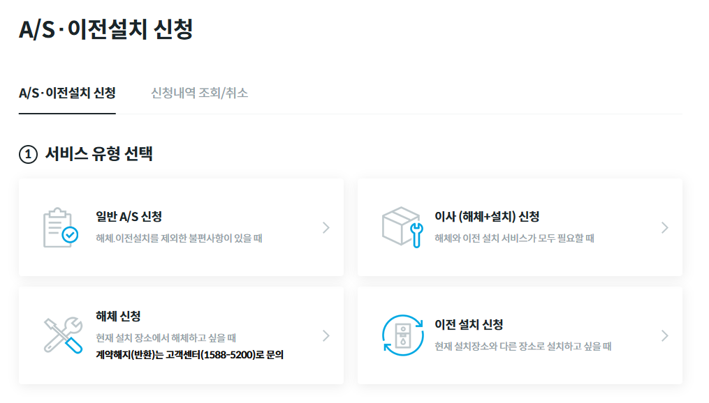 이전 설치는 코웨이 고객센터 1588-5200 로 전화해서 신청하거나 홈페이지에 가서 이전설치를 신청 하면 된다.