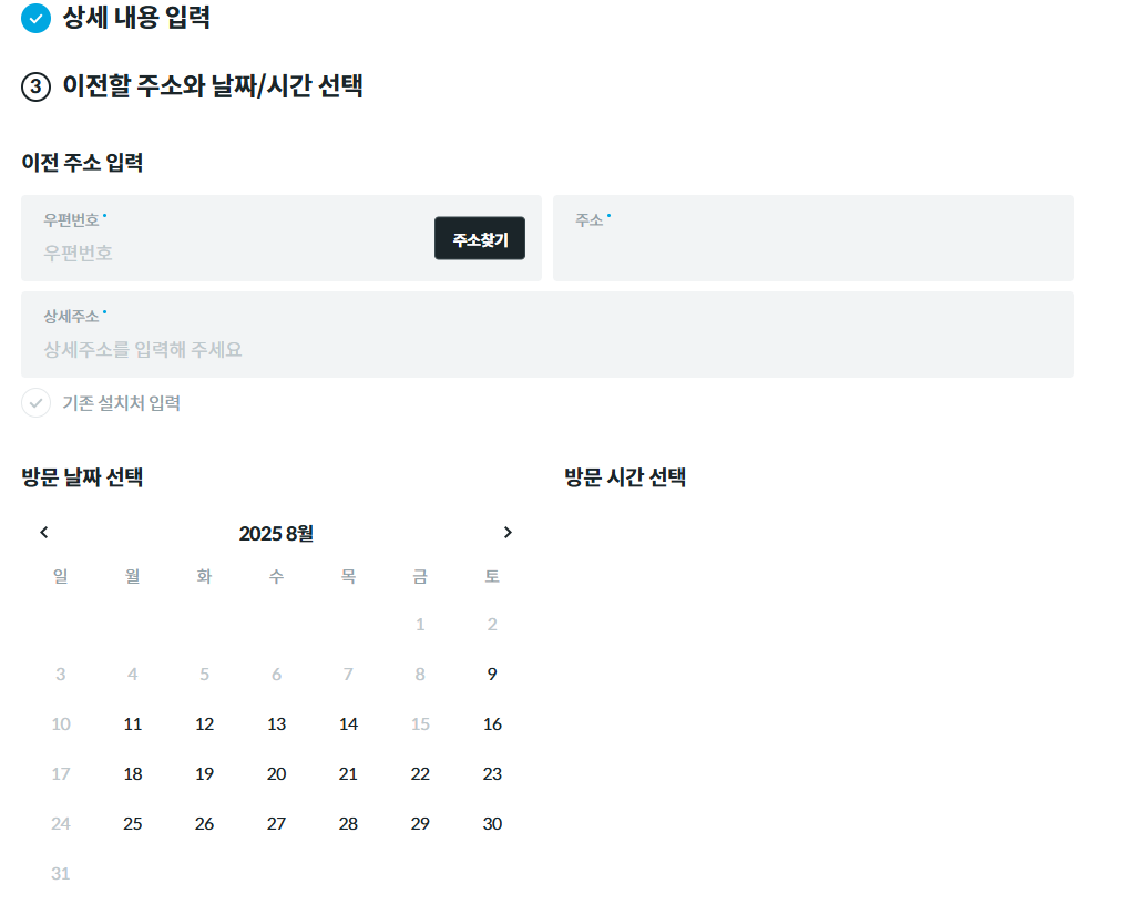 이전 주소와 날짜 방문 시간을 선택 하면 된다.