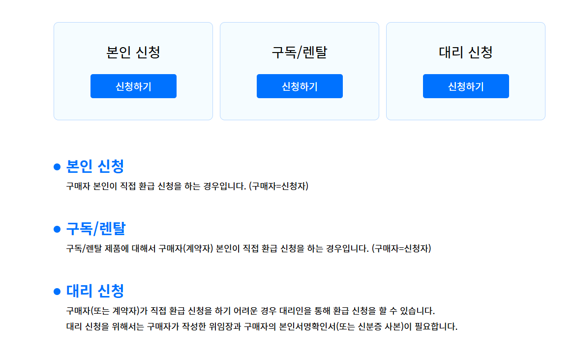 대리 신청 하는 방법이다. 구매자(또는 계약자)가 직접 환급 신청을 하기 어려운 경우 대리인을 통해 환급 신청을 할 수 있고, 대리 신청을 위해서는 구매자가 작성한 위임장과 구매자의 본인서명확인서(또는 신분증 사본)이 필요 하다고 한다.