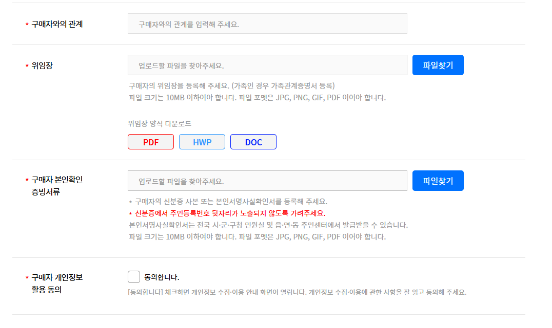 나머지는 신청방법이 똑같은데 대리 신청이기 때문에 신분증, 위임장(가족인경우 가족관계증명서)이 필요하다. 위임자는 PDF,HWP,DOC 으로 제공하니 다운 받아서 작성 하면 된다.