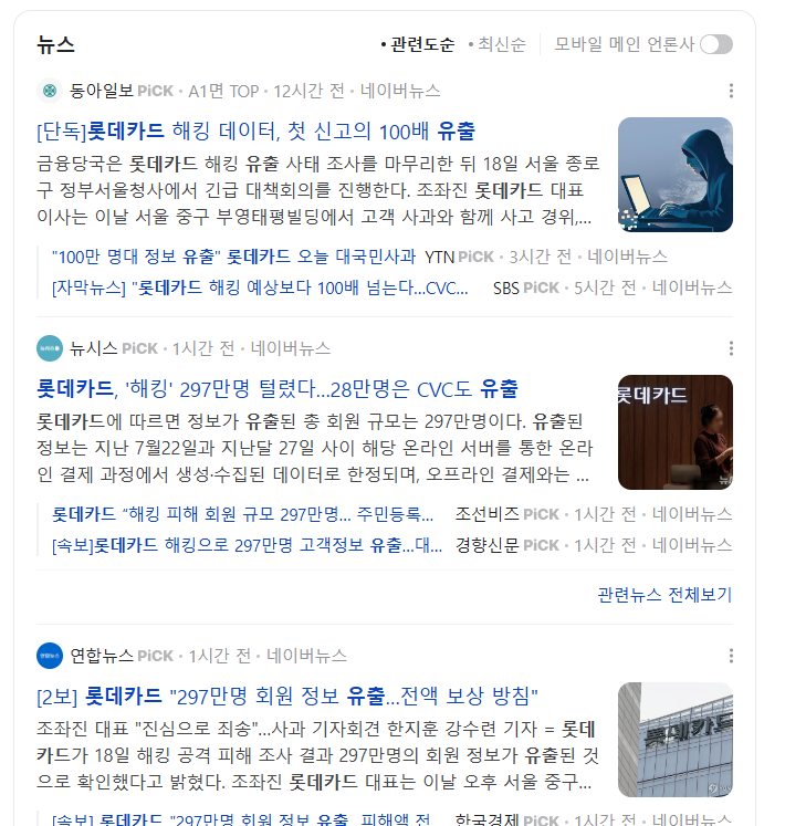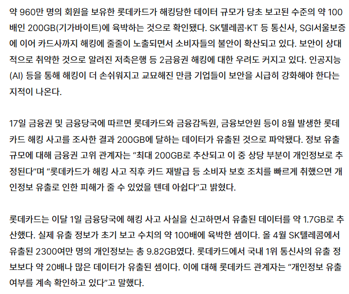 아니 누가 더 많이 털리는지 경쟁하는것도 아니고 SKT 는 10GB 정도인 정보인데 롯데카드는 200GB 란다. 기가차다.