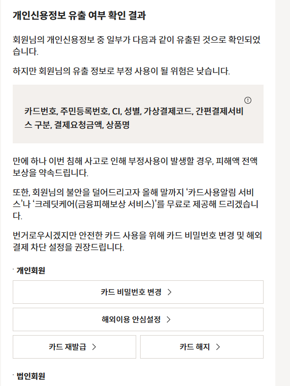 유출 정보가 뜬다. 뭐야... 다 털렸네 젠장..... '위에 만에 하나 이번 침해 사고로 인해 부정사용이 발생할 경우, 피해액 전액 보상을 약속드립니다.' 라고 적혀 있지만 혹시 모르니 밑에 여러가지 방법들이 있으니 조취를 취하자.