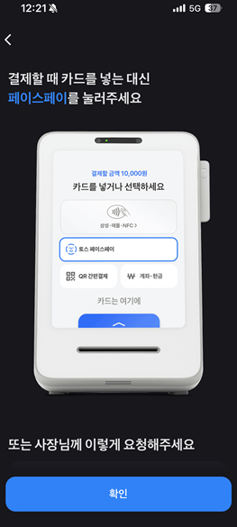 뭐 이렇게 하는 방법이라고 적혀 있지만 그냥 결제할때 토스 페이스페이 할께요 하면 설정을 해준다.