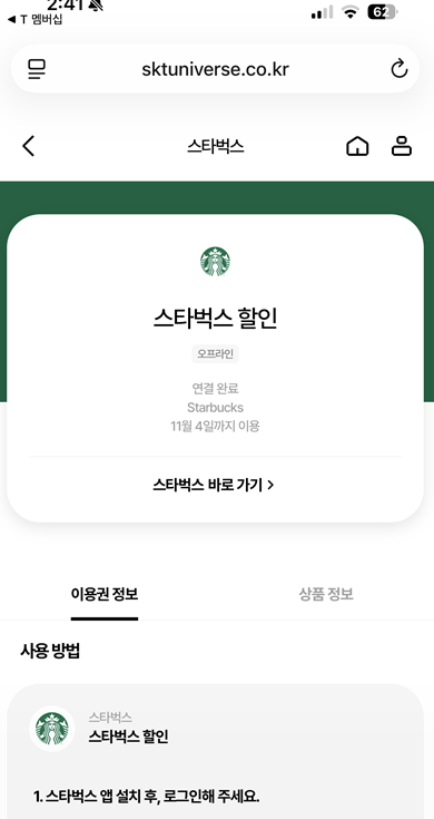 자 이제 스타벅스 연결을 해야 할인이 되는데