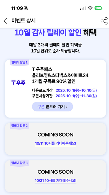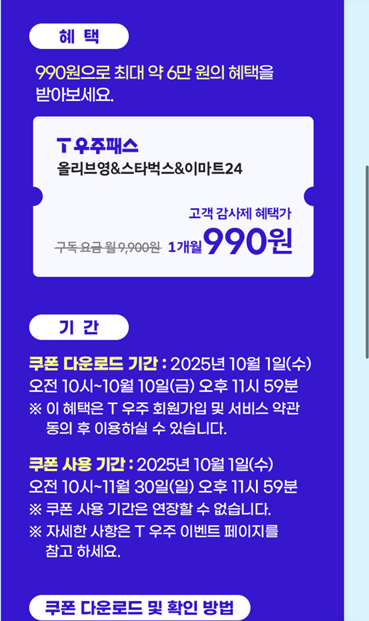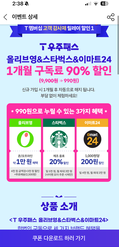 이번 T 고객 감사제는 T 우주패스 올리브영&스타벅스&이마트24 1개월 구독료 90%할인 해준다.