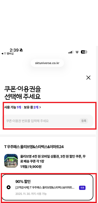 T 멤버십으로 들어가고 쿠폰은 이렇게 자동으로 등록이 된다.