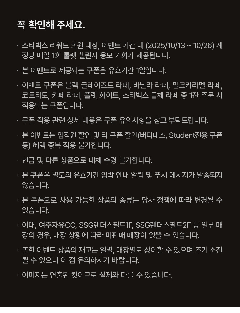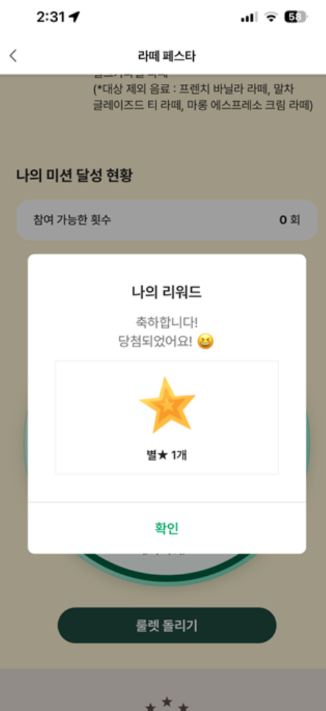 룰렛 당첨은 위와 같다 별이 당첨되면 유효기간은 60일이다. 그리고 나머지 라떼나 사이즈업 50프로는 당일사용이다.