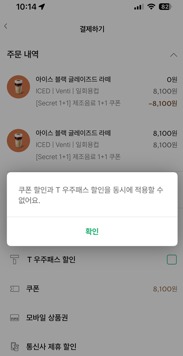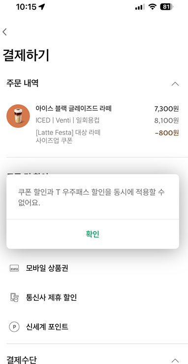 다른 쿠폰과 중복은 안된다. 요즘 라떼 페스타를 하고 있어서 50프로 할인 쿠폰이 나와서 결제 했는데 이건 추가 할인이 적용이 안된다.