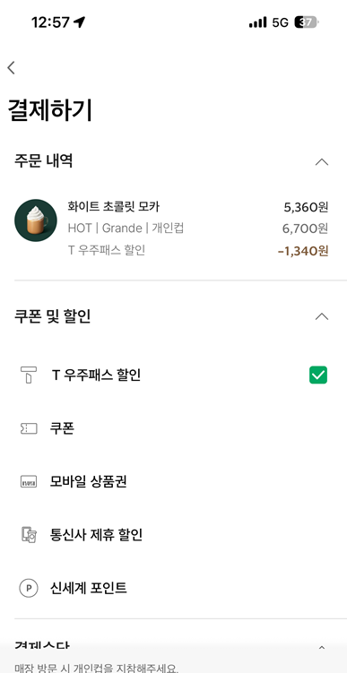 이렇게 사이렌오더 할때 우주패스 할인이 선택이 가능하다. 이건 카드로 결제해도 동일하게 적용이 된다.