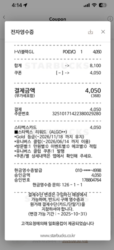 | SKT T day 오픈런 스타벅스 카페 아메리카노 Tall(Hot/Iced) 1잔 무료 쿠폰 발급 (2) | 2025.10.23 |