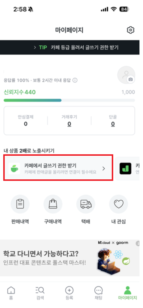 중고나라 앱에 마이페이지에 보면 이렇게 카페에서 글쓰기 권한 받기가 있다.