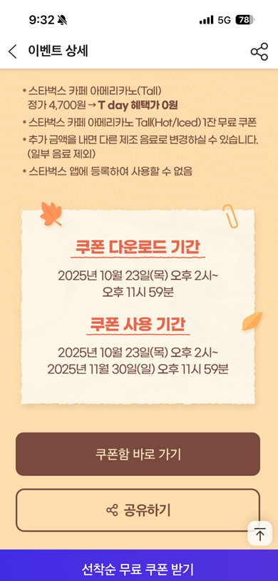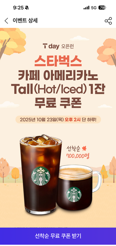 2025년 10월 23일(목) 바로 오늘 오후 2시에 70만명에게 스타벅스 아메리카노 선착순 이벤트를 한다.