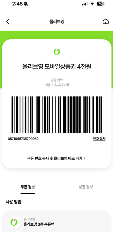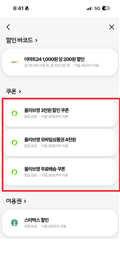 스벅만 이용하지 말고 올리브영 모바일 상품권 4천원도 같이 쓰자.~