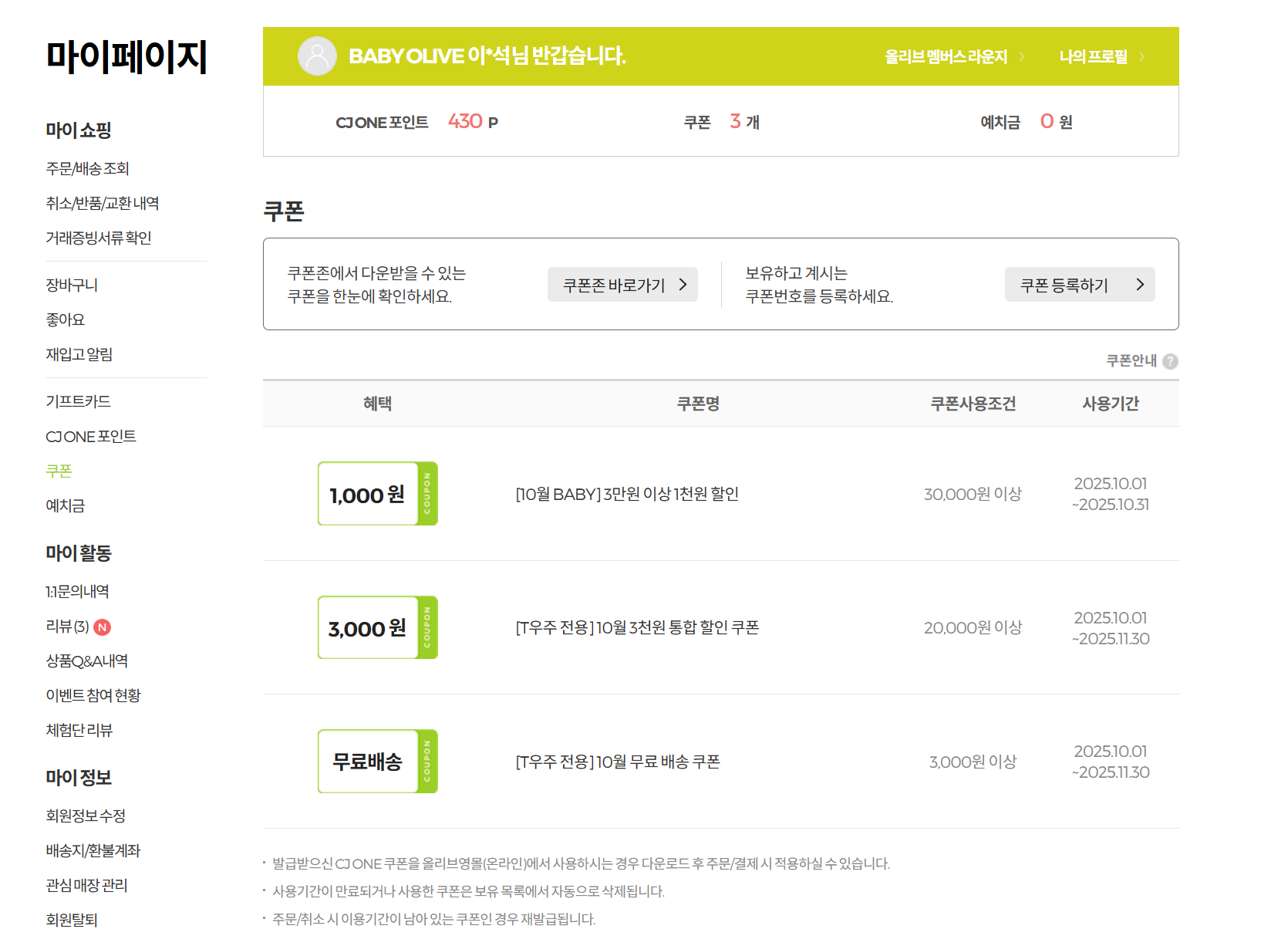 이렇게 올리브영 3종 쿠폰팩이 있다 들어가보자.