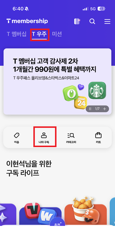 우주패스를 가입을 했으면 스벅 말고도 올리브영 할인 쿠폰을 사용 할 수 있다. T멤버십 어플로 들어가서 T우주 나의 구독에 들어가면