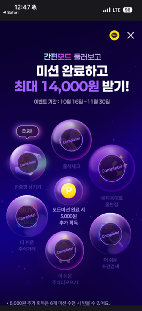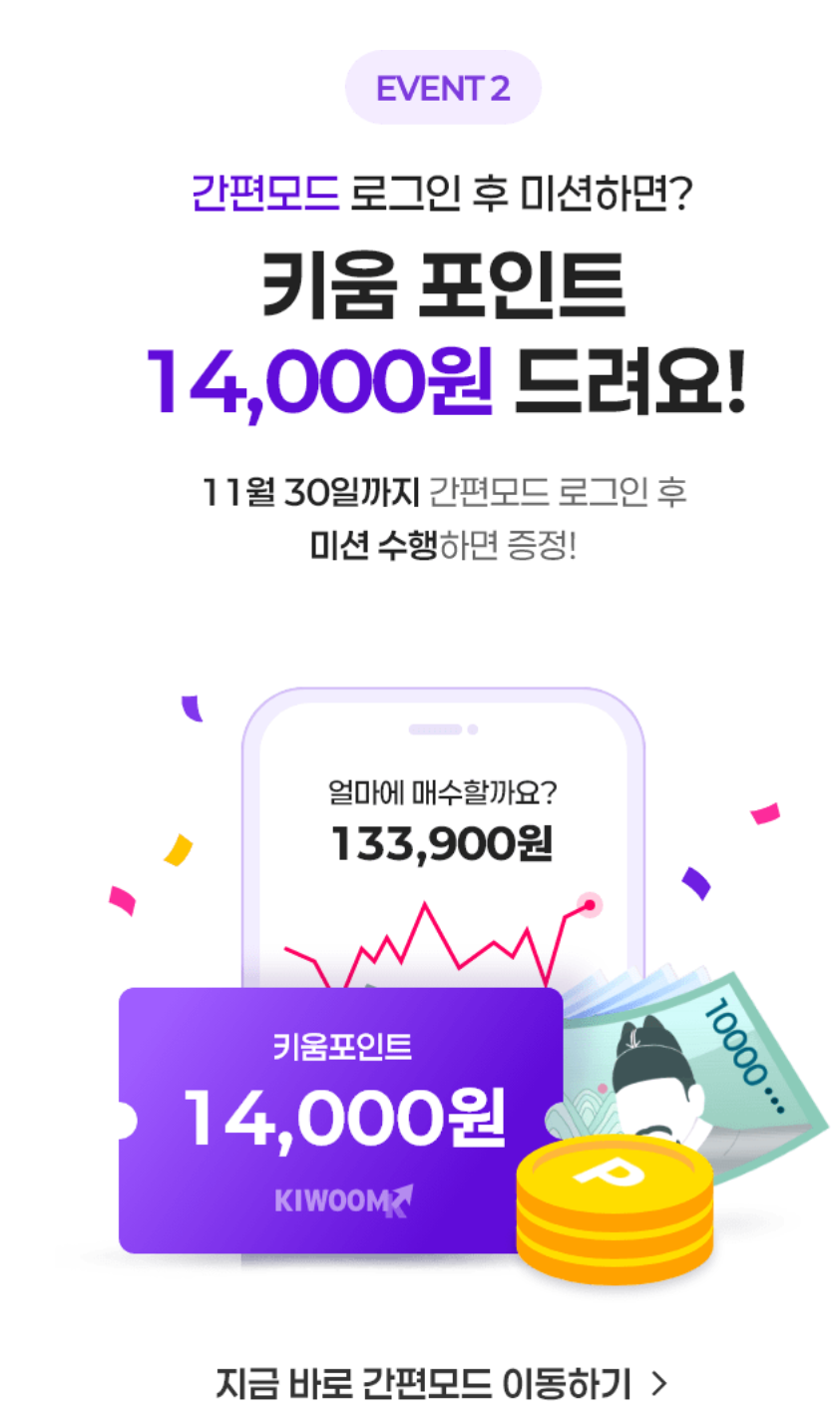 간편모드를 체험하고 공유하면 네이버페이1,000원! 간편모드에 로그인 후 미션하면 키움포인트 14,000원 더!