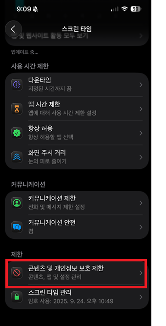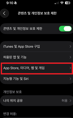 스크린 타임에 들어가서 콘텐츠 및 개인정보 보호 제한에 들어가자