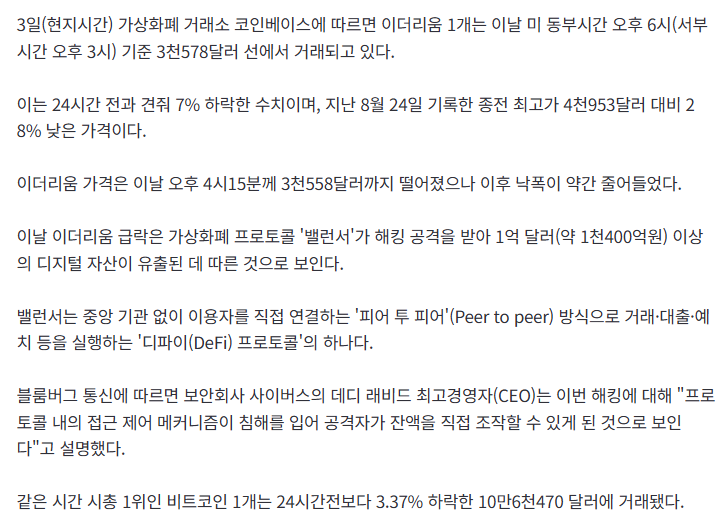 이더리움 1억 달러대 해킹 사건에 7% 급락
