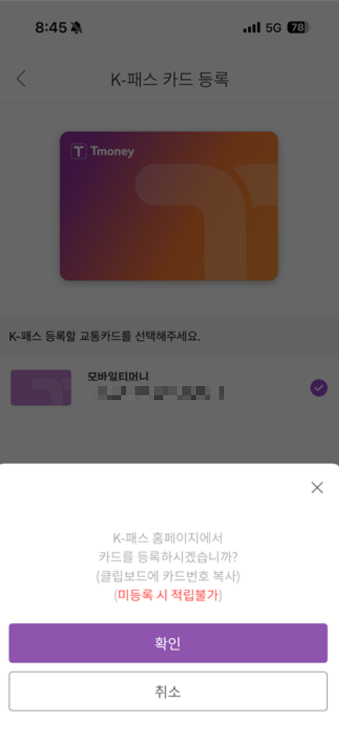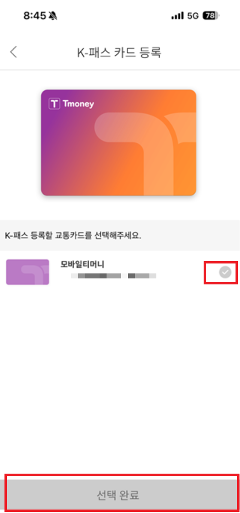 이전에 등록됐던 모바일티머니 교통 카드를 선택하고 등록 해주면 된다.