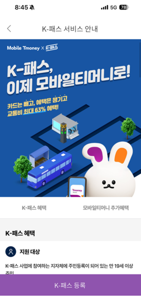 티머니 어플에 들어가면 위와 같이 들어가면 K-패스 라는 메뉴가 생겼다 여기 들어가서 K패스 등록을 누르면