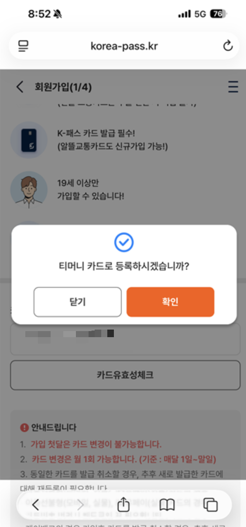 원래 K패스는 카드사에서 K패스 카드를 발급 받아서 등록하는 방식인데 애플은 그것은 안되고 기존에 티머니교통카드를 K패스 사이트에 등록하는 방식으로 사용이 가능하다.