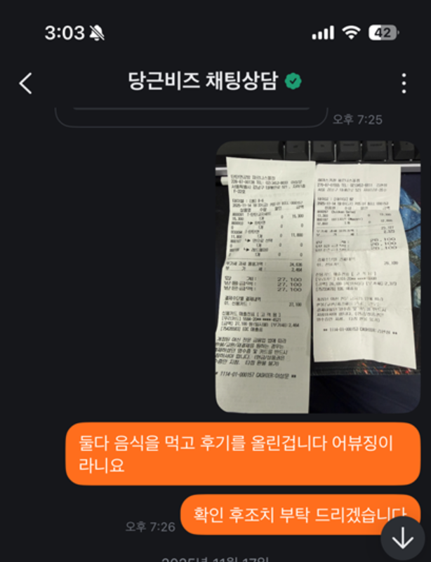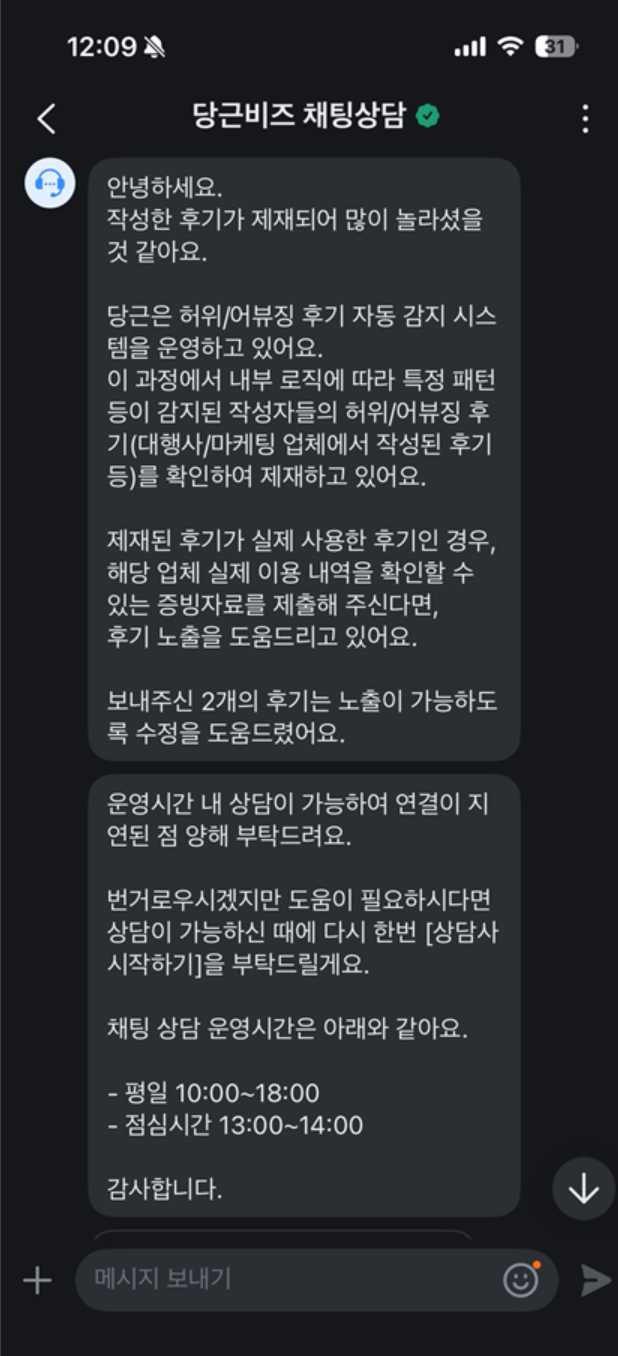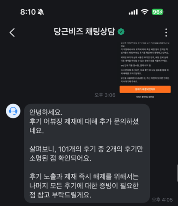 당연히 방금 올린 후기때문이라 생각하고 이렇게 문의를 남겼다.