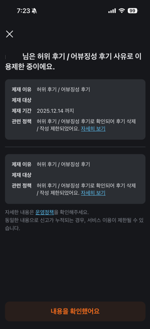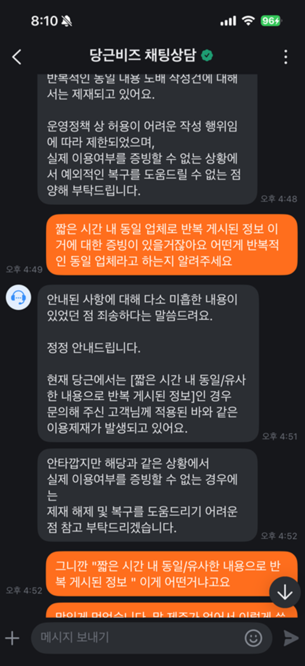 따졌다. 도대체 어떤게 문제가 된건지 다 내가 직접 후기를 쓴거고 사진도 내가 다 찍어서 올린건데 뭐가 문제인지 물어봤는데 답변은 "짧은 시간 내 동일/유사한 내용으로 반복 게시된 정보" 란다. 계속 물어봤더니