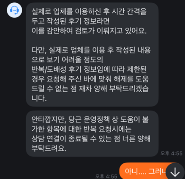 보내주신 2개의 후기는 노출이 가능하도록 수정도움드렸다고 한다. 이게 처음에는 무슨뜻인지 몰랐다. 난 당연히 어뷰징이 풀린줄 알고 다시 후기를 쓰려고 했더니