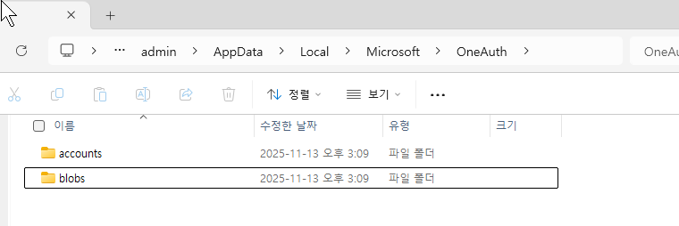 C:\Users%사용자 이름%\AppData\Local\Microsoft\OneAuth\blobs