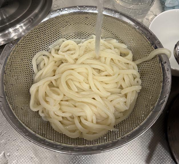 차가물에 면을 여러번 헹구자.