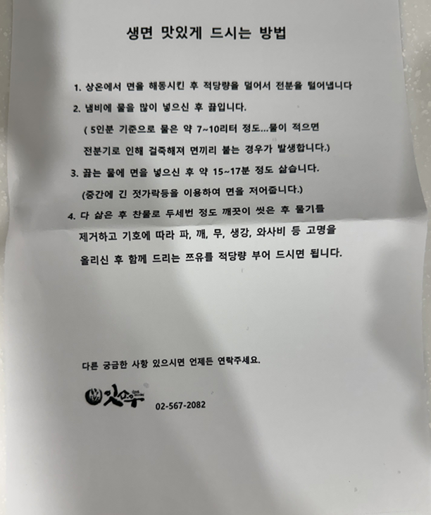 집에 와서 내용을 보니깐 생면 맛있게 드시는 방법이라고 설명이 있고
