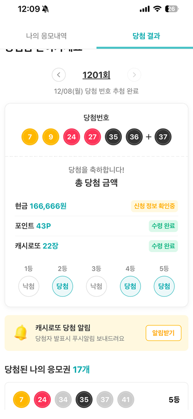 혜택에 들어가니 저번주 캐시로또 당첨 결과 확인하기가 있다 눌러봤다.