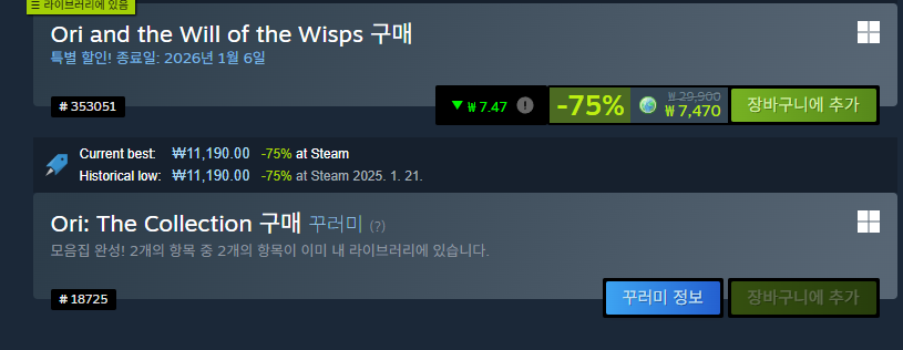 오리와 눈먼숲과 오리와 도깨비불이 합쳐서 할인 판매중이다.