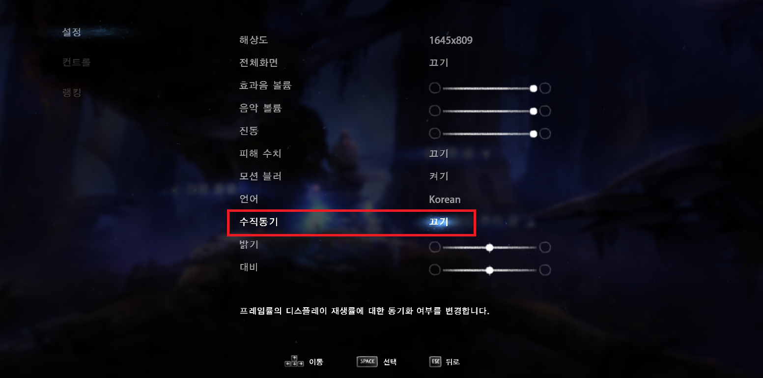 나처럼 슬로우 모션처럼 게임이 된다면 수직동기화를 꺼보도록 하자.