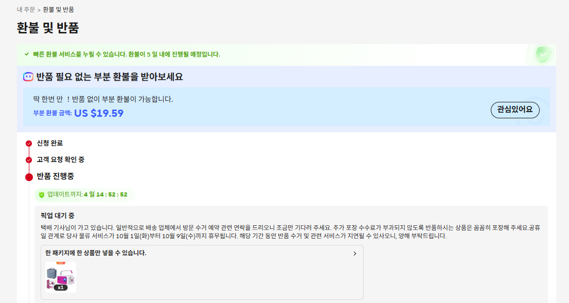 ㅎㅎㅎ 신기하다. 수거 안하고 부분환불 딜을 한다. 아마 반품 배송비가 많이 나오니 딜을 한것 같다. 하지만 놔둬도 안쓸것 같아서 그냥 환불!