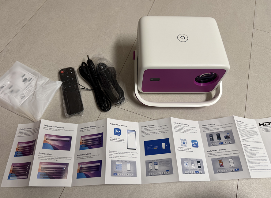 구성품은 이렇다.(본체,hdmi케이블,전원케이블,리모컨,청소면봉,메뉴얼)